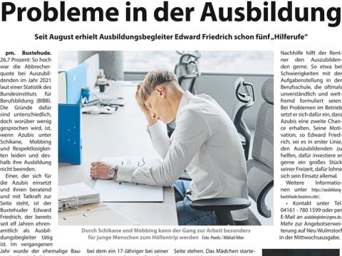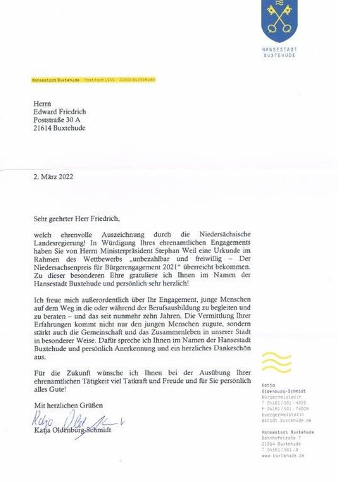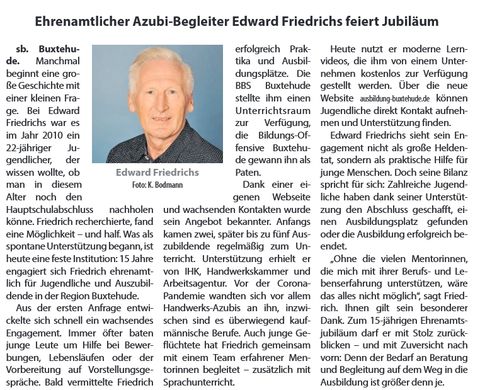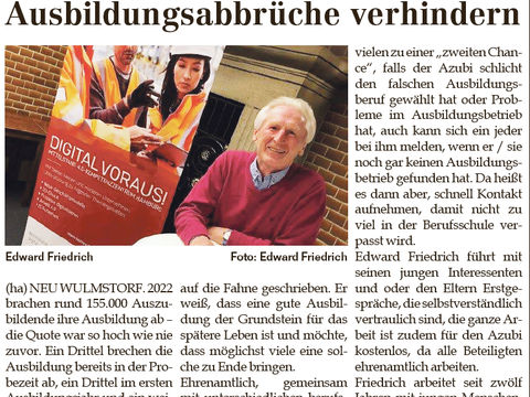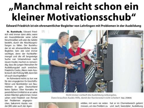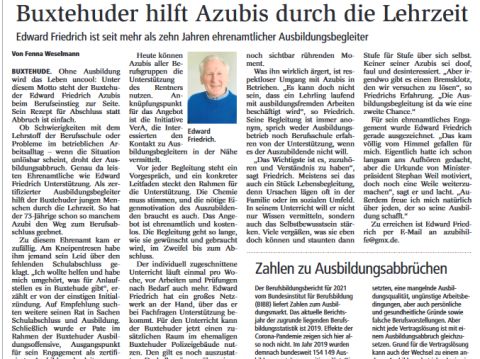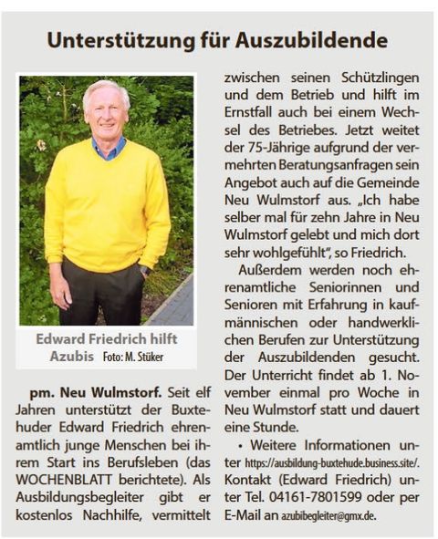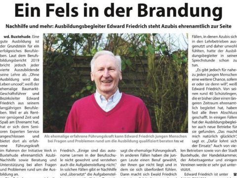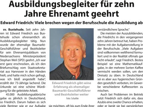 Das Wichtigste an unserer Aufgabe ist es, zuzuhören und Verständnis zu haben. Wir sind keine Lehrer, sondern Mentoren und haben Spaß daran, unser Wissen sowie unsere Erfahrungen weiterzugeben. Edward Friedrich (77) ist seit 2010 ehrenamtlicher Ausbildungsbegleiter in Buxtehude. Der erfahrene Coach hat bereits 50 Auszubildende unterstützt und ist in seiner Heimatstadt für sein Engagement bekannt. 2020 wurde er zum 10-jährigen Ehrenamtsjubiläum vom niedersächsischen Ministerpräsidenten Stephan Weil ausgezeichnet. Wir freuen uns und gratulieren von Herzen! Am 10. September 2025 feiert er sein 15 -jähriges Ehrenamtsjubiläum!