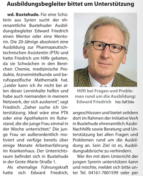 In einer Welt, in der die Herausforderungen in der Ausbildung stetig zunehmen, ist es wichtig einen starken Partner an seiner Seite zu haben. Edward Friedrich (77) hatte am 10. September, sein 15 - jähriges Ehrenamtsjubiläum und sein Team aus berufserfahrenen Mentorinnen und Mentoren, sind berufserfahrene Ausbildungsbegleiter. Sie bieten nicht nur wertvolle Unterstützung, sondern auch individuelle Lösungen für Auszubildende, Suche einer Praktikums - oder Ausbildungsfirma. Mit einem breiten Spektrum an kostenlosen Lernvideos, sowie Nutzung von ChatGPT und einem tiefen Verständnis für die Bedürfnisse der Jugendlichen sorgen sie dafür, dass niemand auf der Strecke bleibt. Vertrauen Sie auf eine persönliche Begleitung, die den Unterschied ausmacht, die Zukunft der Jugendlichen positiv zu gestalten. Der Einzelunterricht, wie in einer Privatschule, Kaltgetränke + Snacks sind kostenlos. E-Mail: azubihilfe@gmx.de Tel:041617801599